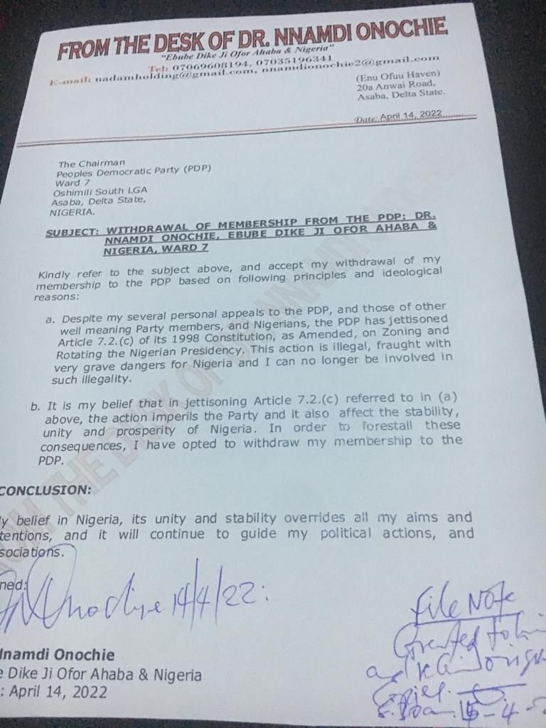 A 2023 presidential aspirant on the platform of the Peoples Democratic Party (PDP), Orefo Nnamdi Onochie, has announced the withdrawal of his membership in the main opposition party in Nigeria.