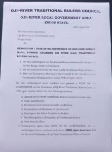 Traditional Rulers in Oji River LGA of Enugu State Thursday passed a Vote of No Confidence on Igwe Godwin Madu, Chairman of Oji River Traditional Rulers Council.