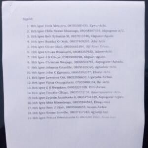 In a statement made available to the press after the meeting, they said that “Consequent upon this VOTE OF NO CONFIDENCE, we the undersigned have resolved and elected HRH, Igwe Lawrence Obi as the new Caretaker Chairman of Oji River Traditional Rulers Council”
