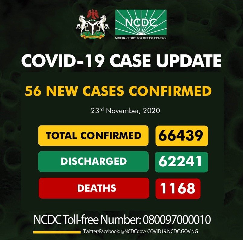 56 new cases of Coronavirus were recorded in Nigeria on Monday, November 23, as confirmed by the Nigeria Centre for Disease Control (NCDC).
