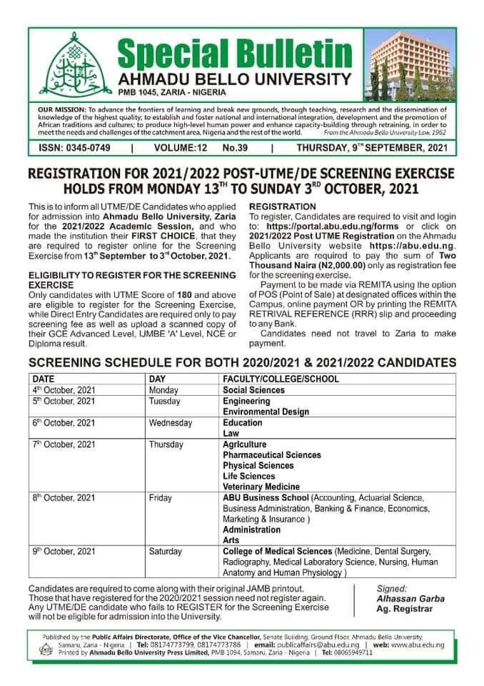 While the screening exercise commence on 4th October with faculty of Social Sciences, 5th Engineering and Environmental Design, 6th Education and Law, 7th Agriculture, Pharmaceutical Sciences, Physical Sciences, life Sciences and Veterinary medicine. 8th ABU business school, Administration and Arts, 9th College of Medical Sciences, Medicine, Dental Surgery, Radiography, medical laboratory science, Nursing, Human Anatomy and Human physiology.