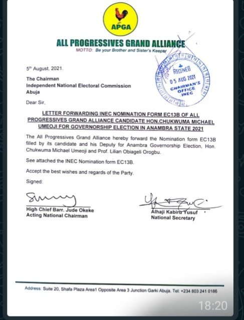 The Independent National Electoral Commission (INEC) has accepted the filled Nomination Forms containing the name of Chukwuma Umeoji as the candidate of the All Progressives Grand Alliance (APGA) for the Anambra governorship election.