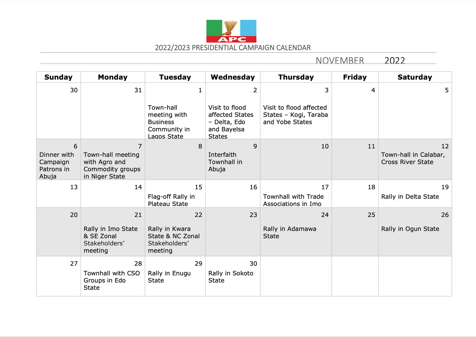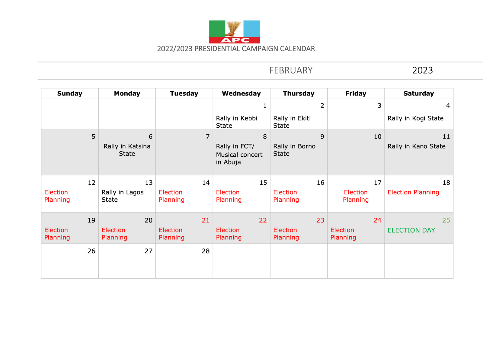 The Presidential Campaign Council of the All Progressives Congress (APC) has released its calendar for the 2023 general elections.