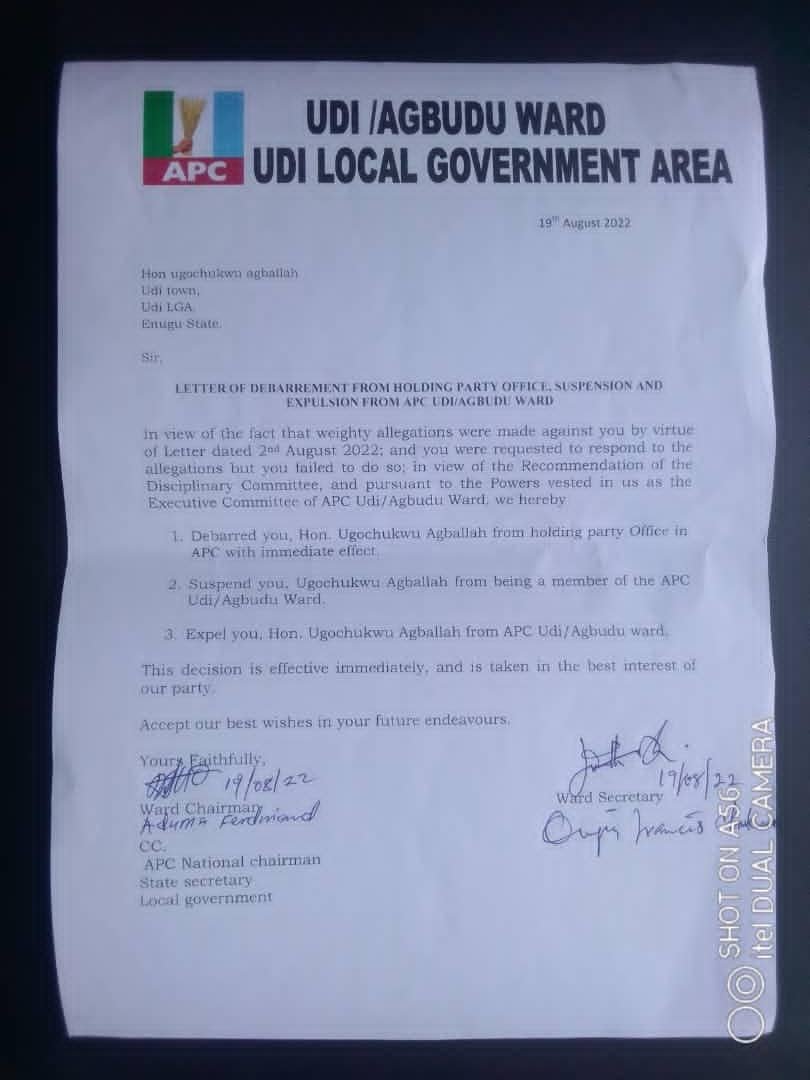 However, in the expulsion letter, the leaders of the party in his ward said he was “requested to respond to the allegations but you failed to do so; in view of the Recommendation of the Disciplinary Committee, and pursuant to the Powers vested in us as the Executive Committee of APC Udi/Agbudu Ward, we hereby debarred you, Hon. Ugochukwu Agballah from holding party Office in APC with immediate effect.
