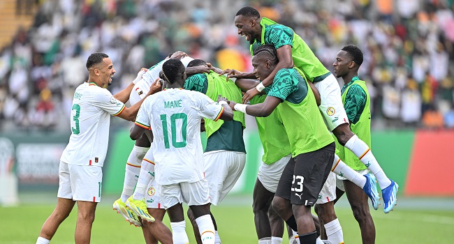 Senegal’s players celebrates scoring their team’s third goal during the Africa Cup of Nations (CAN) 2024 group C football match between Senegal and Gambia at Stade Charles Konan Banny in Yamoussoukro on January 15, 2024. (Photo by Issouf SANOGO / AFP)