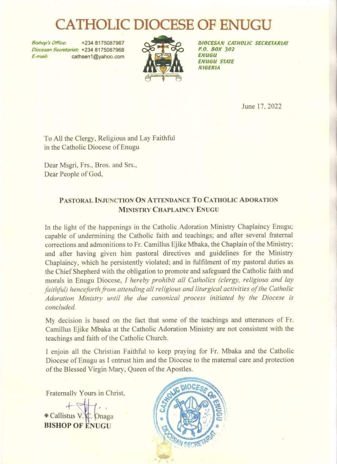 He said in the letter that, “in the light of the happenings in the Catholic Adoration Ministry Chaplaincy Enugu, capable of undermining the Catholic faith and teachings and after several fraternal corrections and admonitions to Fr. Camillus Ejike Mbaka, the Chaplain of the Ministry and after having given him pastoral directives and guidelines for the Ministry Chaplaincy, which he persistently violated and in fulfilment of my pastoral duties as the Chief Shepherd with the obligation to promote and safeguard the Catholic faith and morals in Enugu Diocese, I hereby prohibit all Catholics (clergy, religious and lay faithful) henceforth from attending all religious and liturgical activities of the Catholic Adoration Ministry until the due canonical process initiated by the Diocese is concluded.
