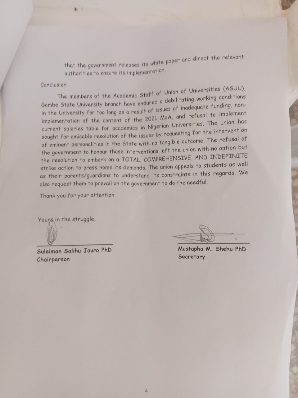 The Academic Staff Union of Universities (ASUU), Gombe State University branch, has declared a total and indefinite strike over a litany of unmet demands.