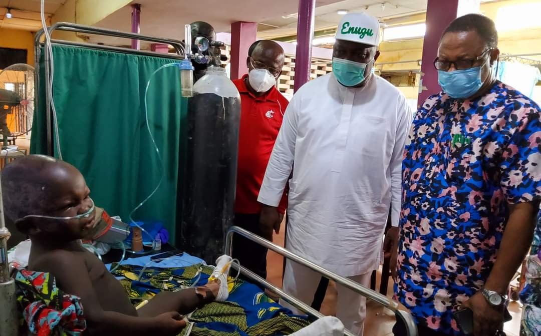 Governor Ifeanyi Ugwuanyi of Enugu State, on returning from Abuja on Sunday, after participating in a series of meetings of the Peoples Democratic Party (PDP), visited the ESUT Teaching Hospital, Parklane, Enugu, to empathise with survivors of the unfortunate fire incidents caused by adulterated kerosene sold in Igbo-Etiti Local Government Area of the state.