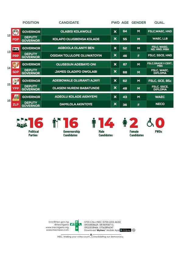 The Independent National Electoral Commission (INEC) has published the final list of candidates for the Ekiti governorship election slated for June 18.