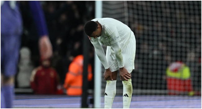 Arsenal’s Brazilian defender #06 Gabriel Magalhaes reacts to their defeat on the pitch after the English FA Cup third-round football match between Arsenal and Liverpool at the Emirates Stadium in London on January 7, 2024. Liverpool won the game 2-0.
