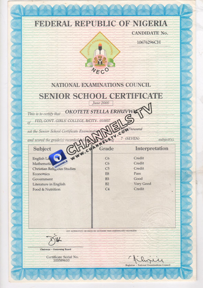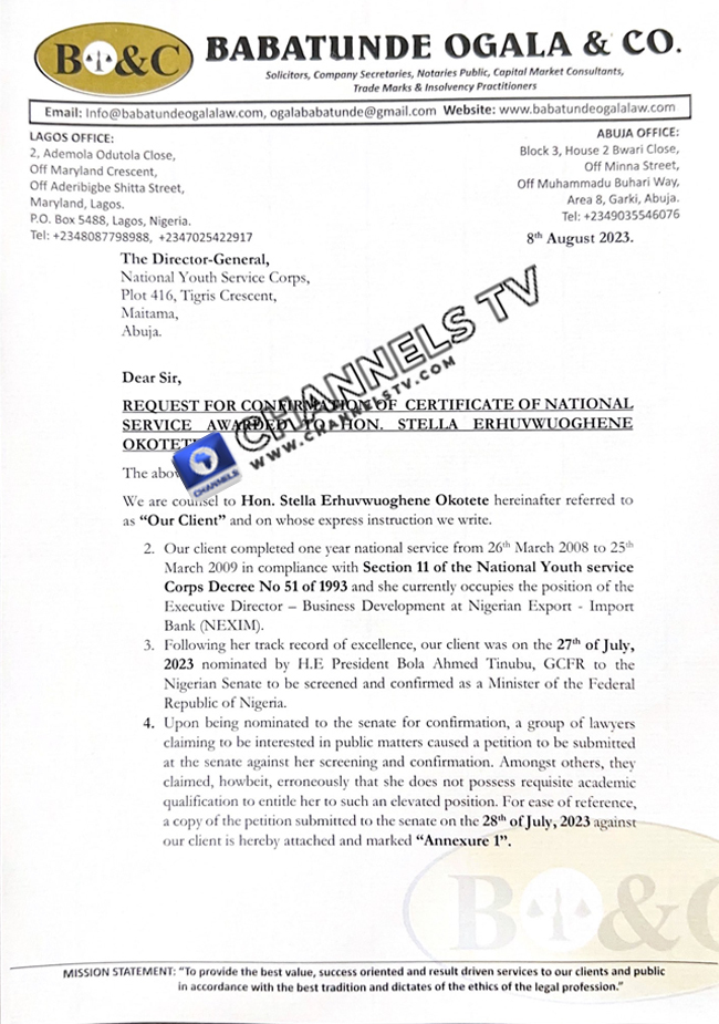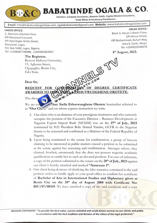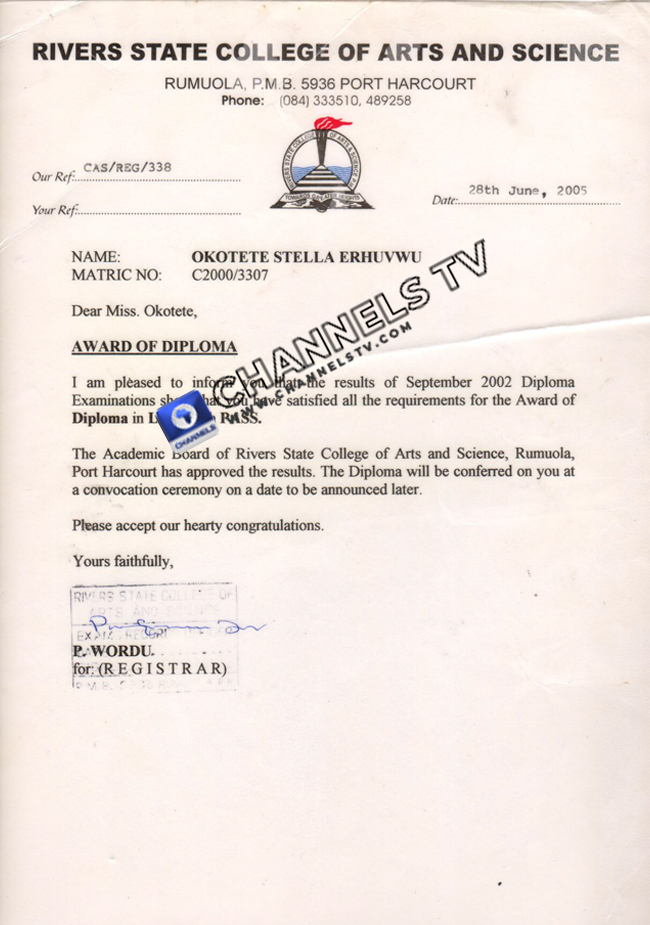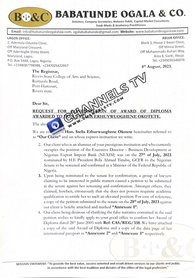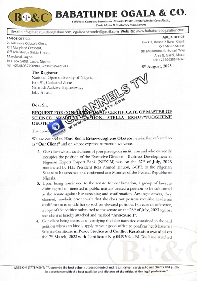 Okotete, a former Executive Director at the Nigerian Export-Import Bank, in a series of documents made available to Channels Television through her lawyers, Babatunde Ogala and Co, wrote to the different relevant institutions to verify the authenticity of her certificates and degrees.