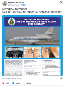 The Nigerian Air Force (NAF) has put up the Falcon 900B aircraft for sale, which is a part of the presidential air fleet, calling on interested buyers to submit their bids.