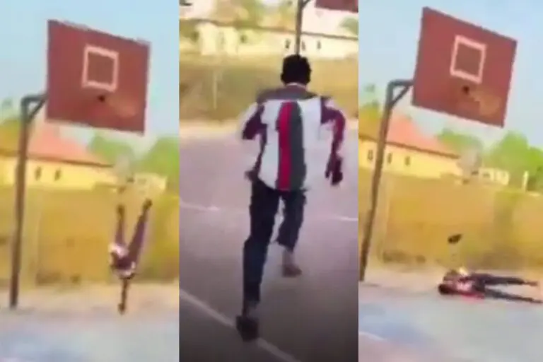 In the video online, he fell and struck his head on the ground.