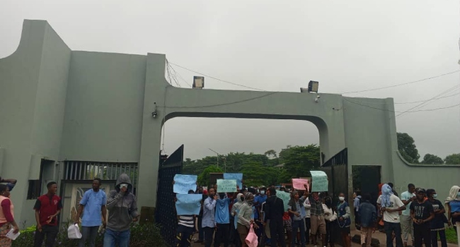 The protest which started in the late hours of Tuesday, continued on Wednesday with the students baring placards at the front of the university gate.