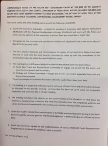 In a Communiqué after the meeting read by the Chairman of the South East Governors’ Forum (SEGF) and Governor of Ebonyi State, Engr. David Umahi, the leaders stated that “Ebubeagu will work with the Police and other security agencies in her operations to protect lives and property in South East”.