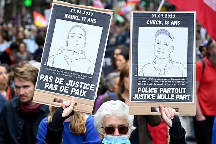 In Paris, demonstrators of all ages held up placards proclaiming “Stop state violence”, “Don’t forgive or forget” or “The law kills”, with a statue of justice with its eyes crossed out in red.