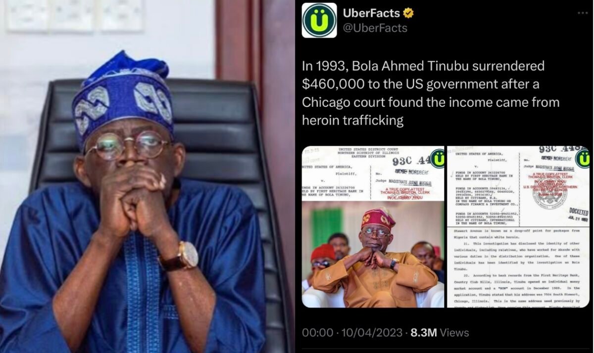 “In 1993, Bola Ahmed Tinubu surrendered $460,000 to the US government after a Chicago court found the income came from heroin trafficking,” UberFacts shared with its 13.5 million global audience at midnight on Monday. The platform attached an article from Peoples Gazette that detailed Mr Tinubu’s criminal run-in with the foreign authorities.