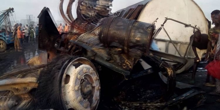The driver of the petrol-bearing truck and his truck boy were burnt to death in the accident.